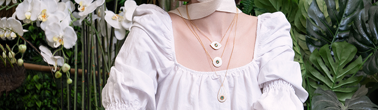 The Jewels of this collection have white and turquoise color combinations. Necklaces like circle and tear in two sizes are all you need for neck layering. See them here!